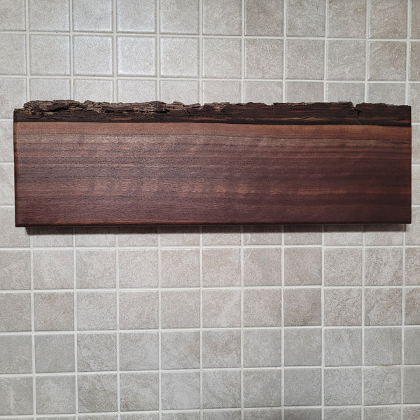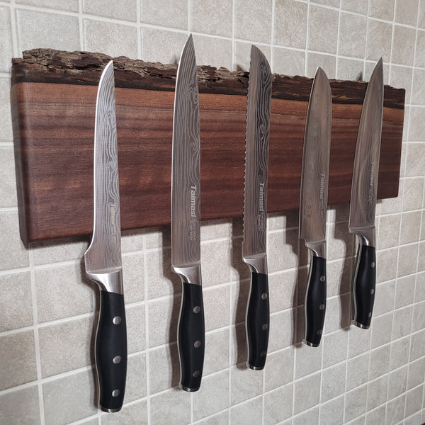 This unique Walnut hardwood knife holder features a full live edge that will create a visual interest in your kitchen. Size: 18” x 5½”. Makes a great gift! (Knives not included)
