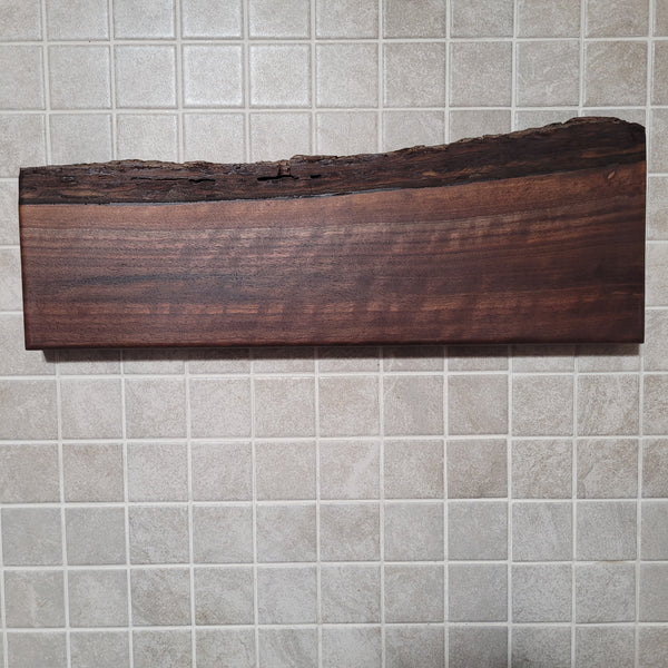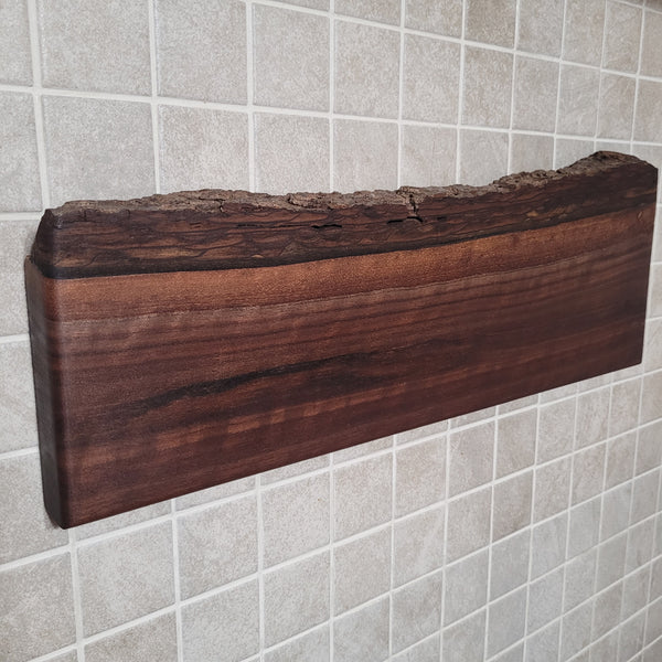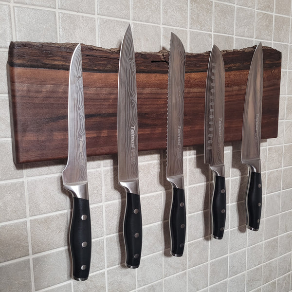 This unique Walnut hardwood knife holder features a full live edge that will create a visual interest in your kitchen. Size: 18” x 5½”. Makes a great gift! (Knives not included)
