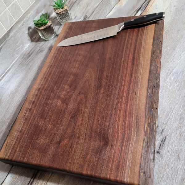 This very unique walnut hardwood cutting board features a live edge that will create a visual interest in your kitchen. This is a durable and easy to maintain board that will last a lifetime with proper care. It is 1½” thick and comes with cut in finger holds, and rubber feet.